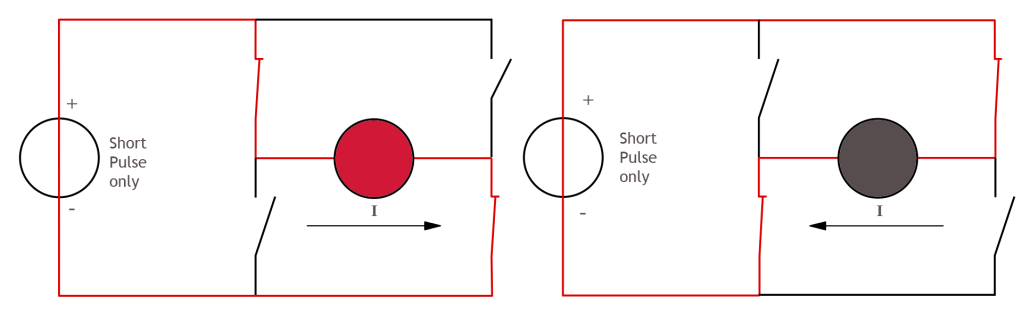 Beim hier verwendeten, zweipoligen Flip Dot wird das Umschalten des Status durch Richtungsänderung des kurzen Stromimpulses durch die Magnetisierungsspule erreicht. Über eine H-Brücke kann die Umschaltung der Stromrichtung im einfachsten Fall vorgenommen werden.