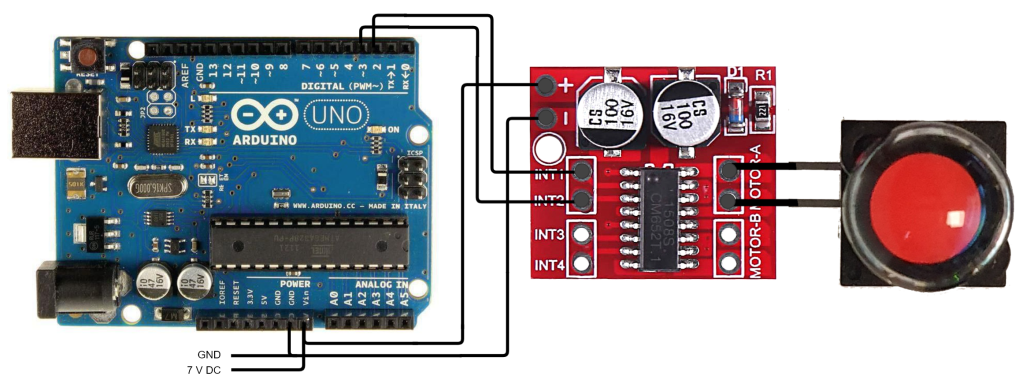 Durch Verwendung eines H-Brücken-Moduls ergibt sich die folgende Ansteuerung durch einen Mikrocontroller (hier ein Arduino Uno).