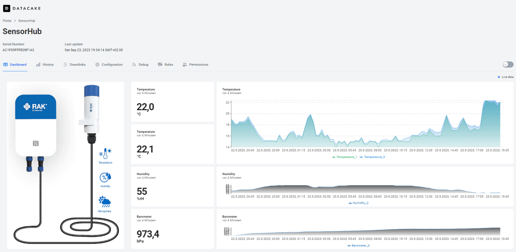 The Sensor Hub equipped with a Sensor Probe containing Temperature and Humidity Sensor RAK1901 and Pressure Sensor RAK1902 measures environmental data and sends them to TTS (CE). Datacake provides for the Visualization.