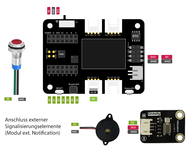 Ich möchte zur Signalisierung eine LED mit Vorwiderstand, einen Piezo-Buzzer oder einen Vibrationsmotor einsetzen. Dem auf dem XIAO-Expansionsboard befindlichen Buzzer konnte ich keinen Ton entlocken und habe deshalb einen externen Piezo-Buzzer eingesetzt. Alle drei Elemente reagieren auf einen Hi-Pegel am betreffenden digitalen Ausgang.