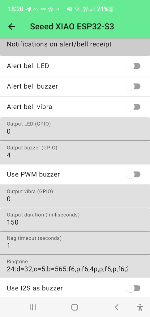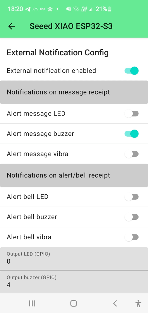 Die beiden folgenden Screenshots zeigen die Konfiguration des Moduls External Notification für den Piezo-Buzzer. Der Piezo-Buzzer ist an D3 und GND angeschlossen. Bei der Konfiguration ist GPIO4 (des ESP32-S3) zu aktivieren. Die Dauer eines Beeps ist 150 ms und die der Ausgabe 1 s. Es werden als mehrere kurze Beeps bein Eintreffen einer Textnachricht ausgegeben.