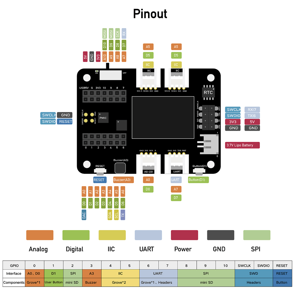 Wie am folgenden Pinout des XIAO-Expansionsboards zu sehen ist, steht nur Pin D0 zur freien Verfügung. Der interne Buzzer ist mit D3 verbunden und wenn auf die SD Card verzichtet wird, dann können auch D2 und D8-D10 noch eingesetzt werden.
