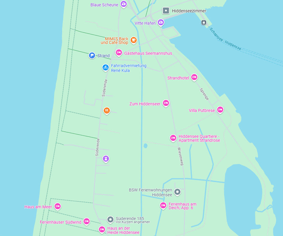 Unser Feriendomizil ist im Süderhof am südlichen Ende von Vitte. Die Standorte des festen Nodes habe ich im Kartenausschnitt unten eingetragen.