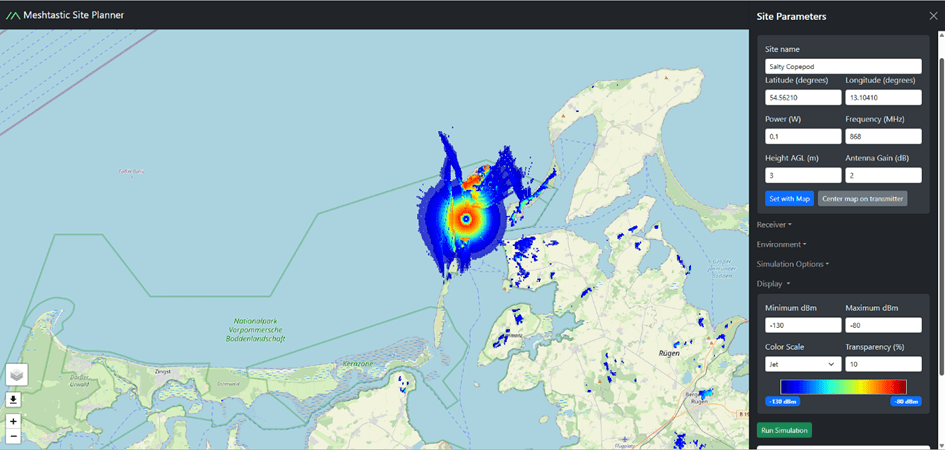 Unter dieser Voraussetzung kann mit dem Meshtastic Site Planner die Abdeckung des Mesh-Netzwerks simuliert werden. Wie die folgende Abbildung zeigt, sollte der gesamte obere Teil der Insel bis hinunter nach Neuendorf abgedeckt werden.