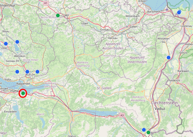 Start ist am oberen Zürichsee mit zahlreichen Nodes in Richtung Zürich, aber erst im Rheintal finden sich weitere Nodes in unserer Fahrtrichtung.