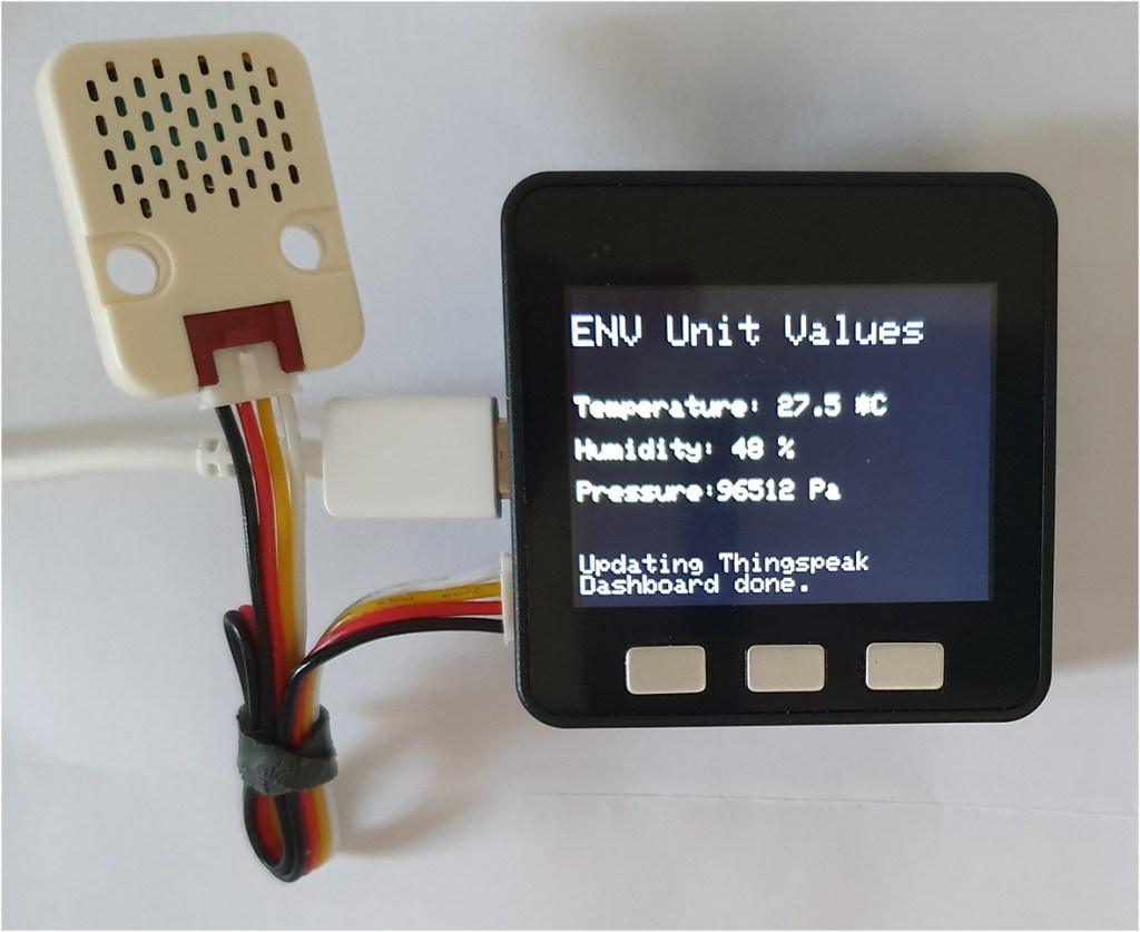 Die ENV Unit ist ein Umgebungssensor, der zur Messung von Temperatur, relativer Luftfeuchtigkeit und Luftdruck verwendet werden kann. Intern werden die Sensoren DHT12 und BMP280 verwendet.