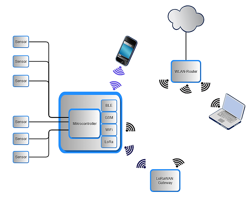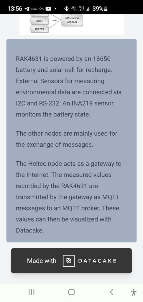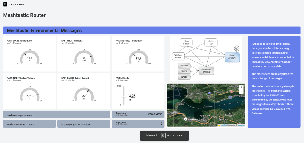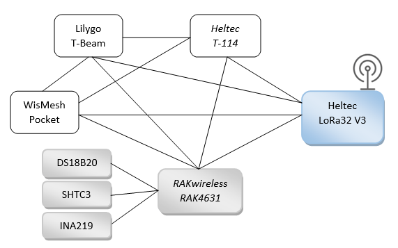 Hervorzuheben sind hier der RAKwireless-Sensorknoten auf Basis eines Mikrocontrollers RAK4631 (nRF52840), der Messwerte über verschiedene Sensoren erfasst und diese im Meshtastic-Netzwerk zur Verfügung stellt, und der Heltec LoRa32 V3 Knoten auf Basis eines ESP32-S3, der eine WiFi-Schnittstelle zur Verbindung mit einem Router und über diesen mit dem Internet ermöglicht. Die anderen Meshtastic-Knoten (in der Abbildung nicht eingefärbt) empfangen die Nachrichten des Sensorknotens und dienen dem üblichen Nachrichtenaustausch.