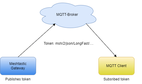 Vom Meshtastic-Gateway werden mit dem Token msh/2/json/LongFast verschiedene MQTT-Messages versendet (published). Ein MQTT-Client abonniert (subscribed) diese Tokens und kann damit die übermittelten Nachrichten weiterverarbeiten.