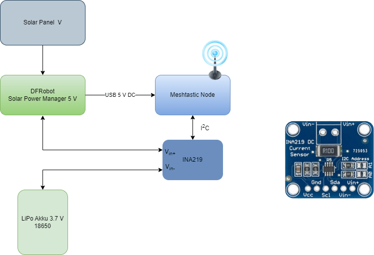 Der Ladezustand des eingesetzten NCR18650 Li-Ion-Akkus muss separat überwacht werden. Hierzu verwende ich einen INA219, der über den I2C-Bus mit dem Grove-Anschluss des RAK1920 Sensor Adapter Modul verbunden wird (siehe Abbildung).