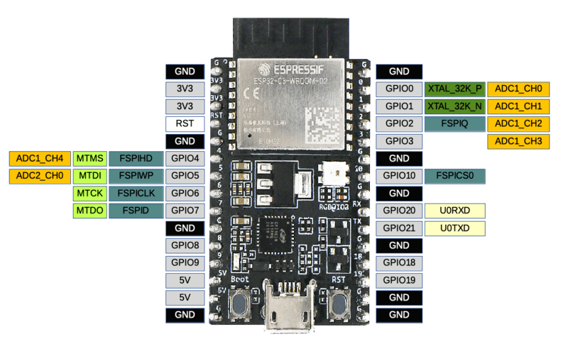 Der ESP32-C3 ist eine 32-Bit-Single-Core-MCU auf RISC-V-Basis (RV32IMC) mit 400 KB SRAM, die mit bis zu 160 MHz getaktet werden kann. Neben integriertem 2,4-GHz-WiFi und Bluetooth 5 (LE) mit Long-Range-Unterstützung verfügt der ESP32-C3 über 22 GPIOs mit Unterstützung für ADC, SPI, UART, I2C, I2S, RMT, TWAI und PWM. Das ausführliche ESP32-C3-Datenblatt finden Sie hier.