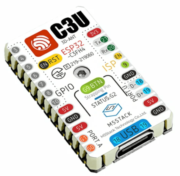 Der M5Stamp-C3U basiert auf dem 32-Bit-RISC-V-Mikrocontroller ESP32-C3 – RV32IMC von Espressif und arbeitet mit einer maximalen Taktfrequenz von 160 MHz.