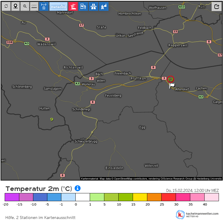 In den folgenden Bildern sind die Profi- und Amateur-Wetterstationen meiner Gegend gezeigt. Abschließend ist der 72 h Verlauf der Umgebungstemperatur gemessen in 2 m Höhe gezeigt.